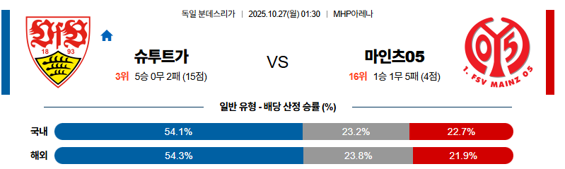 슈투트가르트 대 마인츠 분데스리가 10월27일 맞대결 생중계, 스포츠중계, 스포츠분석