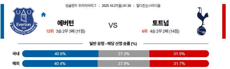 토트넘은 연이은 경기 일정으로 체력적으로 한계가 뚜렷한 상황입니다. 반면 에버튼은 홈 이점을 살려 압박과 전환 템포를 극대화하며 후반 승부를 노릴 가능성이 높습니다. 이 경기는 에버튼이 체력과 동기부여에서 앞서며, 후반 중반 이후 완전히 흐름을 잡을 가능성이 높습니다. 공간 활용과 템포 유지 모두 에버튼의 전술적 준비가 더 완성도 높은 경기로 이어질 것입니다.