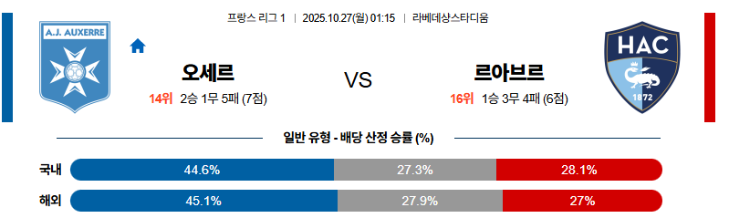 오세르 대 르아브르 리그앙 10월27일 맞대결 생중계, 스포츠중계, 스포츠분석
