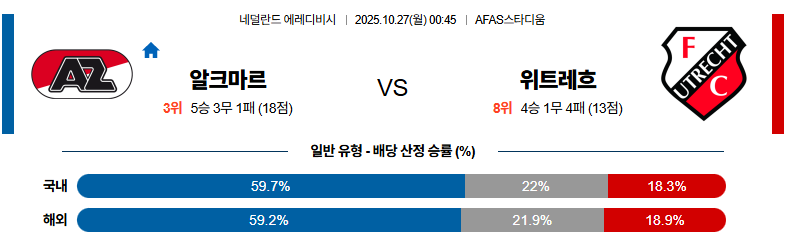 알크마르 대 위트레흐트 에레디비지 10월27일 맞대결 생중계, 스포츠중계, 스포츠분석