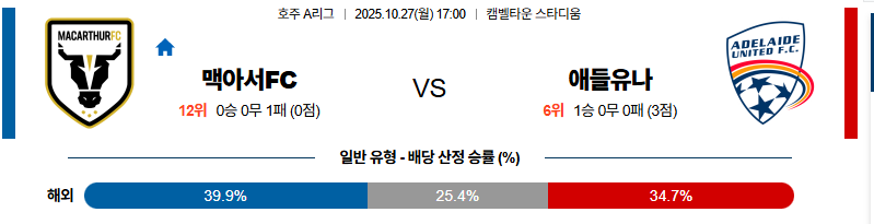 10월27일 맥아서FC:애들레이드 호주A리그 분석 및 예측 스포츠중계:스포츠무료중계