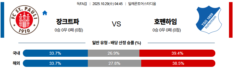 10월29일 상파울리:호펜하임 독일FA컵 분석 및 예측 스포츠중계:스포츠무료중계