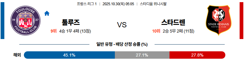10월30일 툴루즈:스타드렌 리그앙 분석 및 예측 스포츠중계:스포츠무료중계