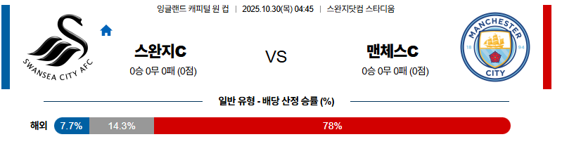 10월30일 스완지시티:맨시티 잉글랜드캐피털원컵 분석 및 예측 스포츠중계:스포츠무료중계