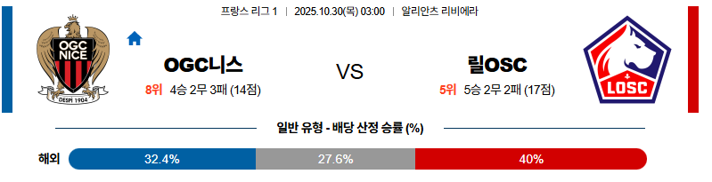 10월30일 니스:릴 리그앙 분석 및 예측 스포츠중계:스포츠무료중계