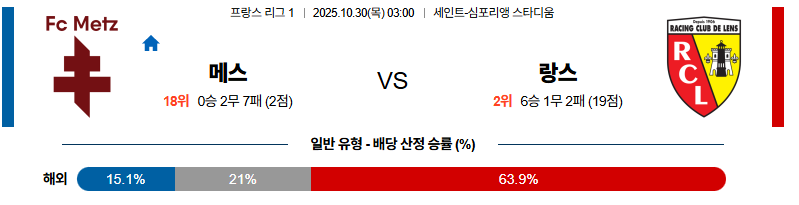 10월30일 메스:랑스 리그앙 분석 및 예측 스포츠중계:스포츠무료중계