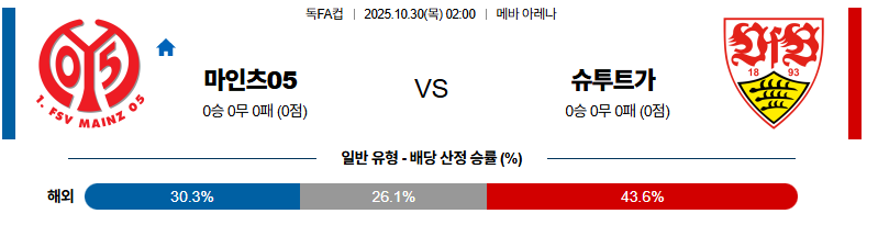 10월30일 마인츠:슈투트가르트 독일FA컵 분석 및 예측 스포츠중계:스포츠무료중계