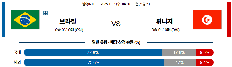 11월19일 브라질:튀니지 남축INTL 분석 및 예측 스포츠중계:스포츠무료중계