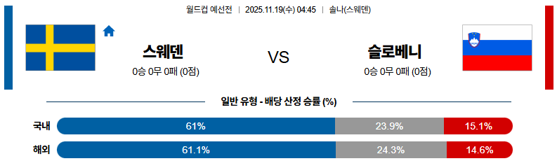 11월19일 스웨덴:슬로베니아 월드컵예선전 분석 및 예측 스포츠중계:스포츠무료중계