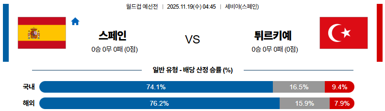 11월19일 스페인:튀르키예 월드컵예선전 분석 및 예측 스포츠중계:스포츠무료중계