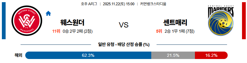 11월22일 웨스턴시드니:센트럴코스트 호주A리그 분석 및 예측 스포츠중계:스포츠무료중계