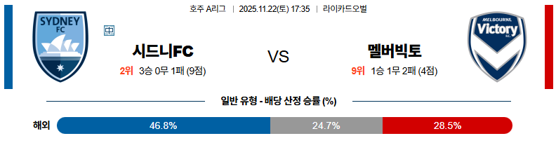 11월22일 시드니FC:멜버른빅토리 호주A리그 분석 및 예측 스포츠중계:스포츠무료중계