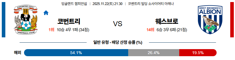 11월22일 코번트리:웨스트브로미치 잉글랜드챔피언쉽 분석 및 예측 스포츠중계:스포츠무료중계