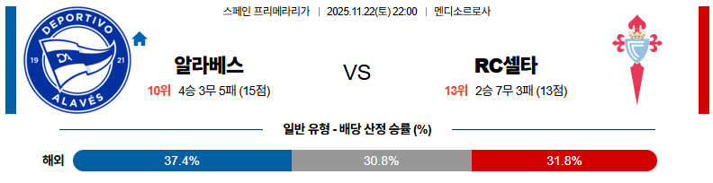 11월22일 알라베스:셀타비고 라리가 분석 및 예측 스포츠중계:스포츠무료중계
