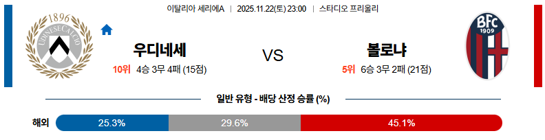11월22일 우디네세:볼로냐 세리에A 분석 및 예측 스포츠중계:스포츠무료중계