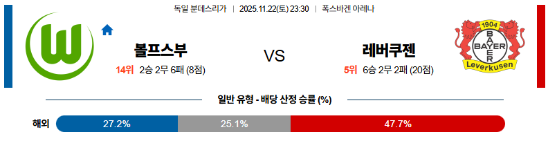 11월22일 볼프스부르크:레버쿠젠 분데스리가 분석 및 예측 스포츠중계:스포츠무료중계