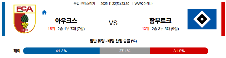 11월22일 아우크스부르크:함부르크 분데스리가 분석 및 예측 스포츠중계:스포츠무료중계
