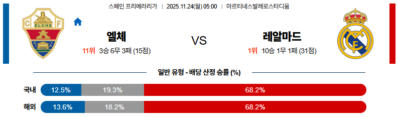 11월24일 엘체:레알마드리드 라리가 분석 및 예측 스포츠중계:스포츠무료중계
