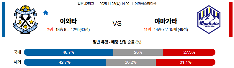 11월23일 주빌로이와타:야마가타 J리그2 분석 및 예측 스포츠중계:스포츠무료중계