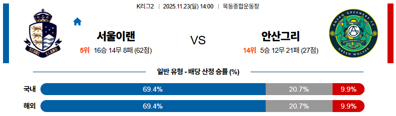 11월23일 서울이랜드:안산 K리그2 분석 및 예측 스포츠중계:스포츠무료중계