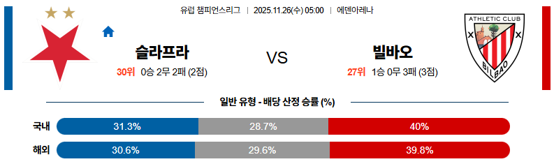 11월26일 슬라비아프라하:빌바오 UEFA챔피언스리그 분석 및 예측 스포츠중계:스포츠무료중계