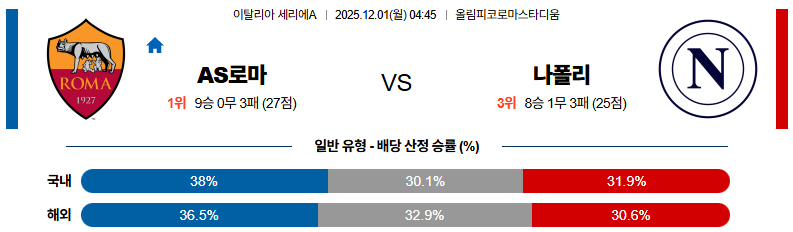 12월01일 AS로마:나폴리 세리에A 분석 및 예측 스포츠중계:스포츠무료중계