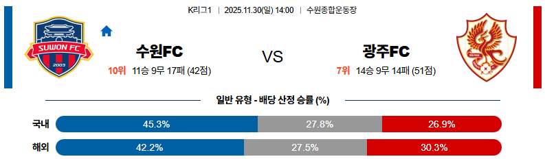 11월30일 수원FC:광주 K리그1 분석 및 예측 스포츠중계:스포츠무료중계