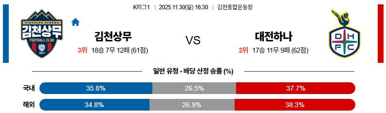 11월30일 김천상무:대전 K리그1 분석 및 예측 스포츠중계:스포츠무료중계