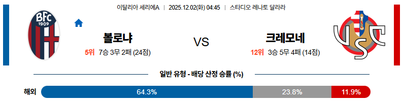 12월02일 볼로냐:크레모네세 세리에A 분석 및 예측 스포츠중계:스포츠무료중계