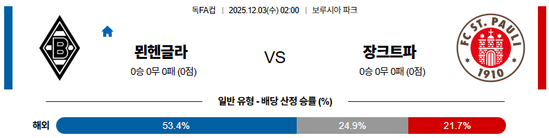 12월03일 묀헨글라트바흐:상파울리 독일FA컵 분석 및 예측 스포츠중계:스포츠무료중계