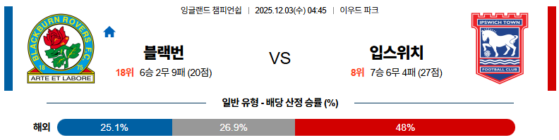 12월03일 블랙번:입스위치 잉글랜드챔피언쉽 분석 및 예측 스포츠중계:스포츠무료중계