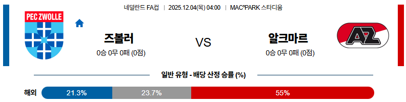 FC즈볼레 대 알크마르 네덜란드FA컵 12월04일 맞대결 생중계, 스포츠중계, 스포츠분석