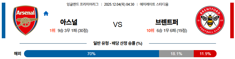 아스널 대 브렌트퍼드 프리미어리그 12월04일 맞대결 생중계, 스포츠중계, 스포츠분석