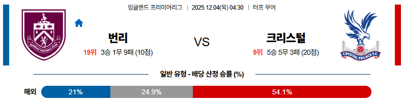 번리 대 크리스탈팰리스 프리미어리그 12월04일 맞대결 생중계, 스포츠중계, 스포츠분석