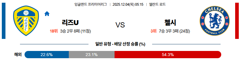 이 경기는 전술 구조와 라인 간 간격, 하프스페이스를 누가 더 효과적으로 활용하느냐가 승패를 좌우하는 매치업입니다. 리즈 유나이티드는 전방 압박으로 초반 분위기를 가져올 수 있지만, 뒷라인 커버 타이밍이 늦어지는 순간마다 첼시의 2선과 측면 자원에게 큰 공간을 내줄 위험이 있습니다. 첼시의 승리 방향으로 해석하고 접근하는 것이 보다 현실적이고 설득력 있는 선택으로 보입니다.