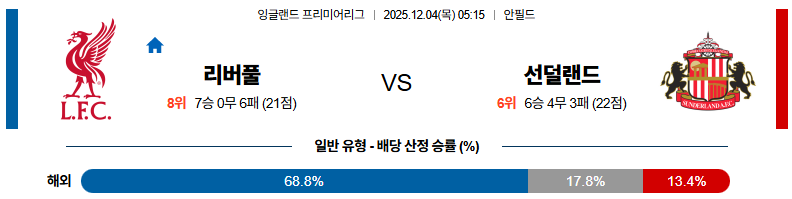 이 경기는 수비 라인을 얼마나 높게 세우느냐보다 중원 압박의 타이밍이 맞느냐가 승부를 가르는 포인트입니다. 리버풀은 맥 앨리스터의 전진 패스와 에키티케·살라의 침투 패턴을 기반으로 선더랜드의 압박을 효과적으로 공략할 준비가 되어 있습니다. 시간이 지날수록 선더랜드의 중원 간격 관리와 수비 밸런스에서 균열이 커질 가능성이 높아, 리버풀이 홈에서 승리할 확률이 높습니다.