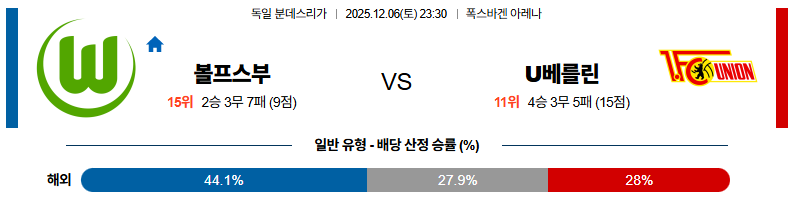 볼프스부르크 대 우니온베를린 분데스리가 12월06일 맞대결 생중계, 스포츠중계, 스포츠분석