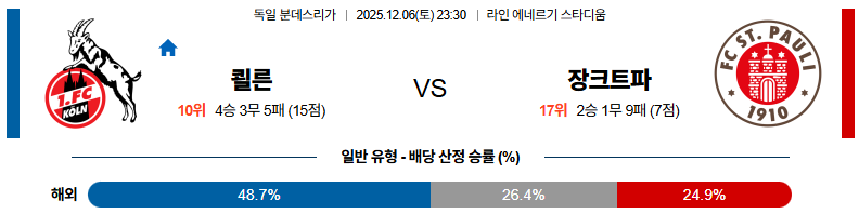 쾰른 대 상파울리 분데스리가 12월06일 맞대결 생중계, 스포츠중계, 스포츠분석