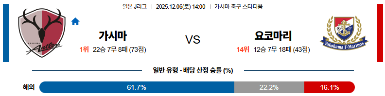 가시마는 스즈키와 엘베르의 박스 장악력, 후나바시의 인프런트 프리킥을 앞세워 우승이 걸린 홈 경기에서 전술과 심리 모두에서 우위를 점할 수 있는 팀입니다. 요코하마 마리노스는 전환 상황에서 날카로운 장면을 만들어낼 수 있지만, 우승 경쟁의 중심에 서 있는 팀은 아니기 때문에 가시마와 같은 수준의 절박함을 유지하기는 쉽지 않을 것입니다. 따라서 이 경기는 가시마가 승리를 통해 J리그 우승을 확정 지을 가능성이 높아 보입니다.