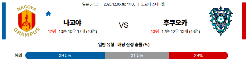 후쿠오카는 벤 칼리파와 코노의 개인 능력으로 위협적인 장면을 만들 수 있지만, 수비 커버 타이밍과 라인 간격이 무너지는 구조적인 문제가 여전히 발목을 잡고 있습니다. 반면 나고야는 이즈미의 침투 타이밍과 키무라의 제공권, 모리의 라인 컨트롤을 중심으로 유기적으로 엮어가는 전술 틀이 잘 잡혀 있습니다. 따라서 오늘 경기는 홈팀 나고야가 측면 뒷공간을 집요하게 파고들며 후쿠오카의 불안한 수비를 무너뜨릴 가능성이 높습니다.