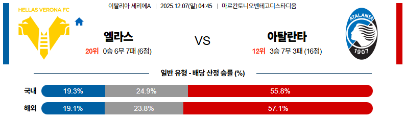 엘라스베로나 대 아탈란타 세리에A 12월07일 맞대결 생중계, 스포츠중계, 스포츠분석