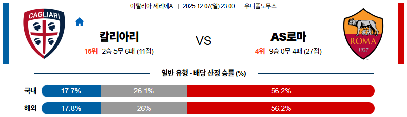 칼리아리 대 AS로마 세리에A 12월07일 맞대결 생중계, 스포츠중계, 스포츠분석