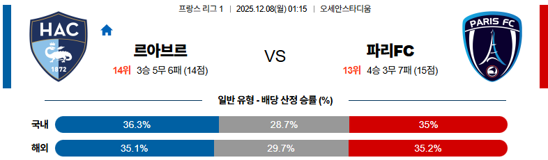 르아브르 대 파리FC 리그앙 12월08일 맞대결 생중계, 스포츠중계, 스포츠분석