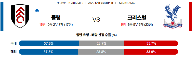 풀럼 대 크리스탈팰리스 프리미어리그 12월08일 맞대결 생중계, 스포츠중계, 스포츠분석