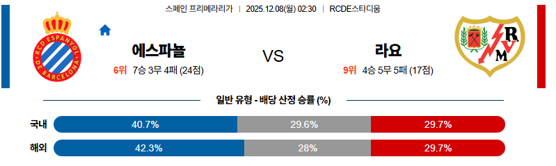 RCD 대 에스파뇰 라리가 12월08일 맞대결 생중계, 스포츠중계, 스포츠분석