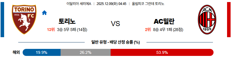 토리노 대 AC밀란 세리에A 12월09일 맞대결 생중계, 스포츠중계, 스포츠분석