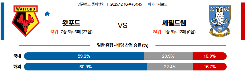 왓포드 대 셰필드웬즈데이 잉글랜드챔피언쉽 12월10일 맞대결 생중계, 스포츠중계, 스포츠분석