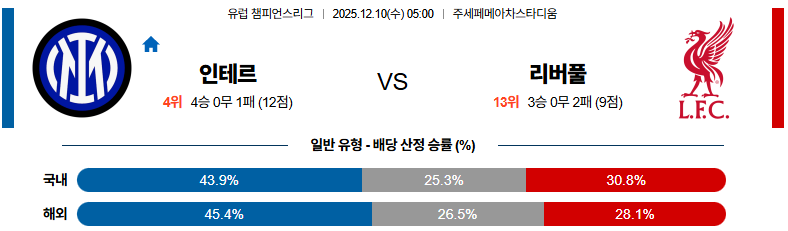 인터밀란이 리드를 잡고 경기 전체 템포를 관리하는 시나리오가 자연스럽게 그려집니다. 리버풀은 팀 구조와 분위기가 무너져 있는 상황에서 반전을 이어갈 체력이 부족할 것으로 보입니다.