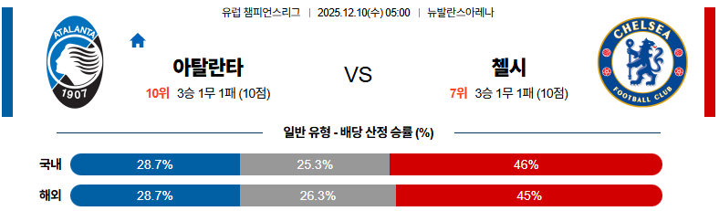 이 경기는 이름값보다 전방 압박과 전환 속도가 승부를 가르는 한 판이 될 가능성이 큽니다. 아탈란타는 높은 지역에서 볼을 빼앗은 뒤 바로 페널티박스로 파고드는 과감한 전개와, 후반에도 압박 강도를 유지해 줄 수 있는 교체 자원을 갖추고 있습니다. 첼시는 빌드업 능력과 개별 공격수의 재능은 충분하지만, 강한 압박과 하프스페이스 공략을 동시에 받는 구조에서 후방 실수가 실점으로 이어질 리스크가 분명합니다. 종합하면, 전술 완성도와 압박 유지력, 교체 카드 깊이까지 모두 감안했을 때 아탈란타가 홈에서 자신들의 스타일을 그대로 밀어붙이며 승부를 정리할 가능성이 더 높아 보입니다.