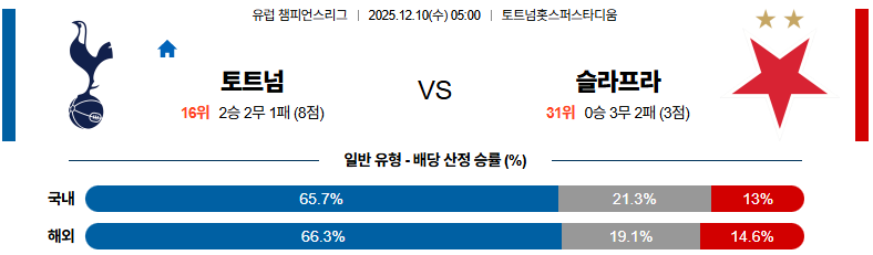 이번 경기는 단순한 전력 차이를 넘어, 라인 간격과 하프스페이스 활용 능력에서 토트넘이 얼마나 안정적인 그림을 그려내느냐가 핵심입니다. 토트넘은 팔리냐를 중심으로 중원을 장악하고, 사비 시몬스가 수비와 미드필더 사이 벌어진 공간을 반복적으로 파고들며 히샬리송에게 찬스를 공급하는 구조를 만들 수 있습니다. 슬라비아 프라하는 쓰리백과 윙백 운영 특성상 라인 사이 공간이 벌어질 위험을 안고 있으며, 전환 수비와 조직력이 완벽하지 않은 이상 이 약점을 숨기기 어렵습니다. 종합적으로 봤을 때, 전술적 상성과 라인 간격 관리, 그리고 홈에서의 주도권까지 감안하면 토트넘이 승리를 가져갈 가능성이 더 높은 매치업입니다.